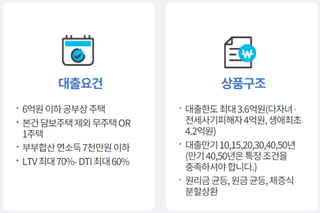주택담보대출은 6억원이하 공부상 주택으로 본건 담보주택 제외 무주택 OR 1주택을 가지신분들이 자격조건이 가능합니다. 부부합산소득 7천만원이하이며, 대출한도는 최대 3.6억원입니다. 다자녀/전세사기 피해자의 경우 4억원, 생애최초는 4.2억원의 한도를 가집니다.